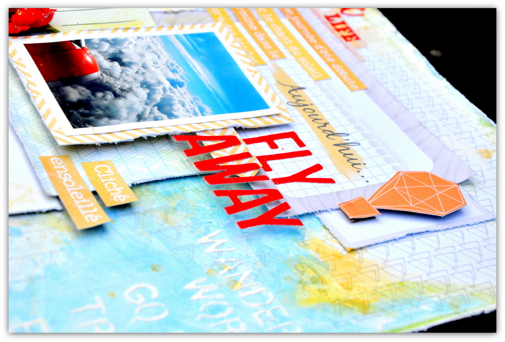 I used a die by Sizzix called Block Talk Bigz alphabet to cut out my title. The word 'Away' was first glued to a piece of plastic backing so it could sit slightly elevated from the page. The word 'magic' is from another set by Sizzix 'Holiday Script 2'.