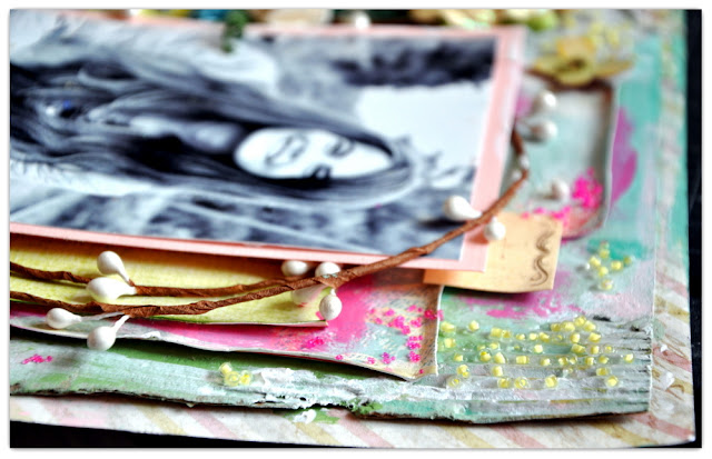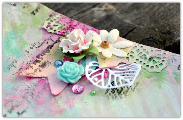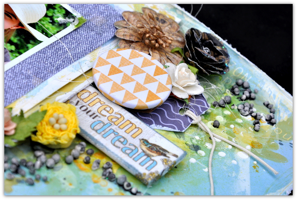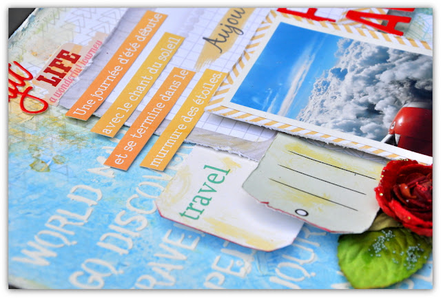 I used gesso, mist and paints on my background as well as my watercolour crayons by Prima.. The 'travel words' were added using a stencil by Tim Holtz and I must say I quite like the effect. I bought a couple of similar ones,but with other words and you'll be