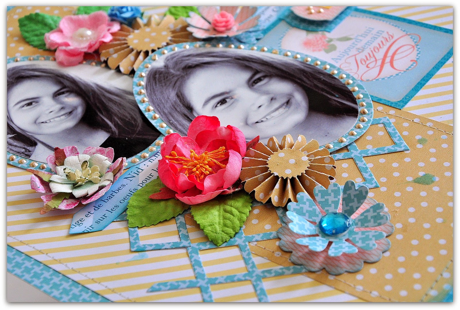 I used mostly the April kit from my fave kit club Scraps of Elegance for this page. The papers are by Bo Bunny and Glitz, and the red paper inside the trellies is by Papirdesign.
