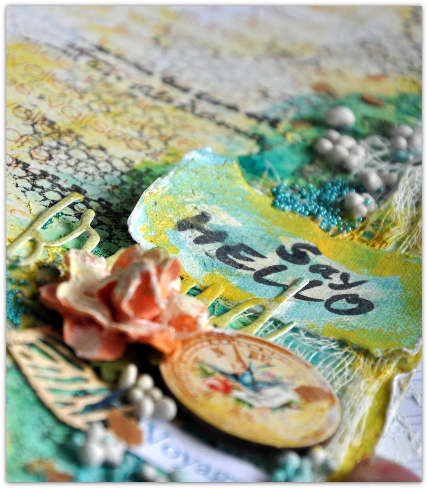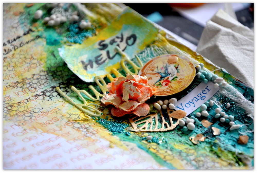 I used gesso, mist and paints on my background as well as my watercolour crayons by Prima.. The 'travel words' were added using a stencil by Tim Holtz and I must say I quite like the effect. I bought a couple of similar ones,but with other words and you'll be